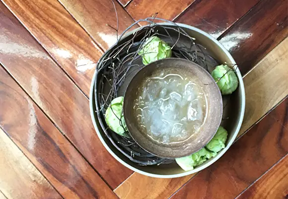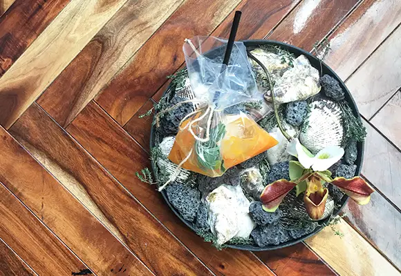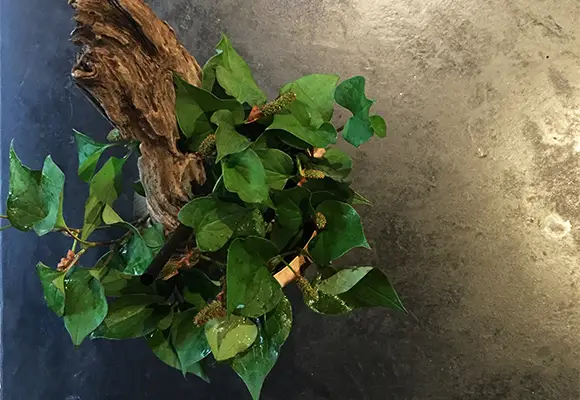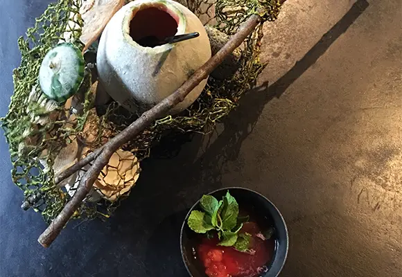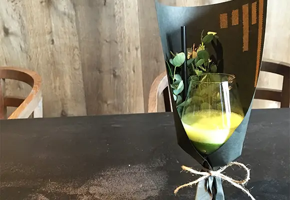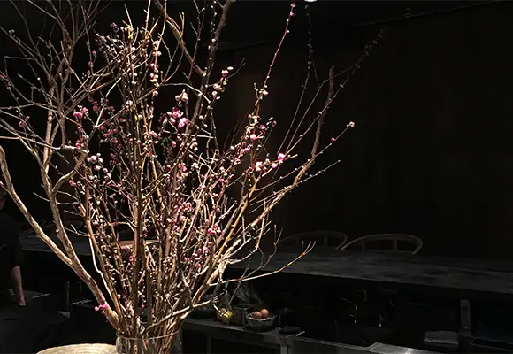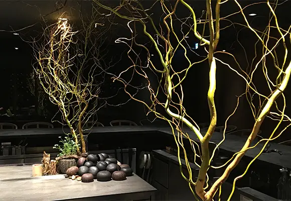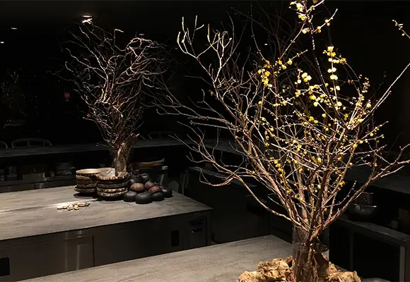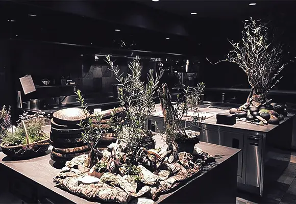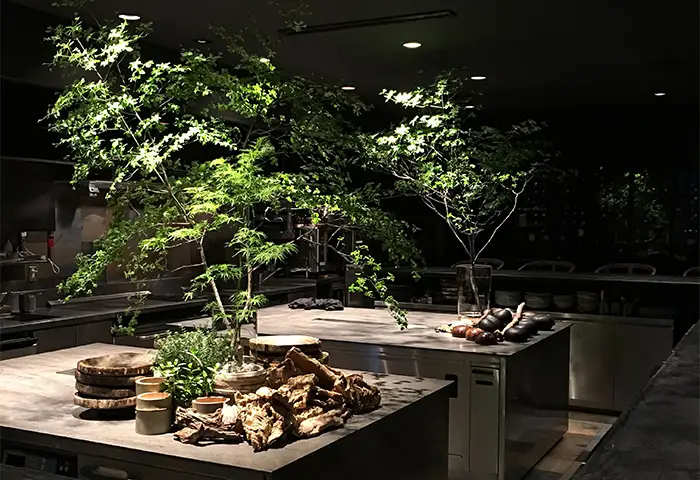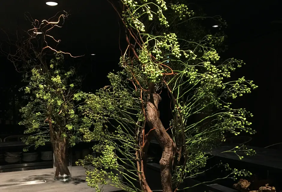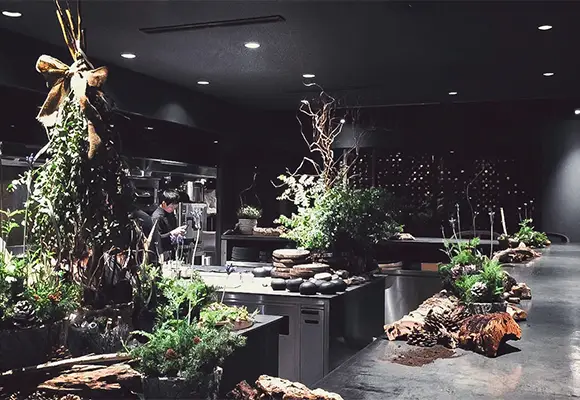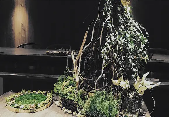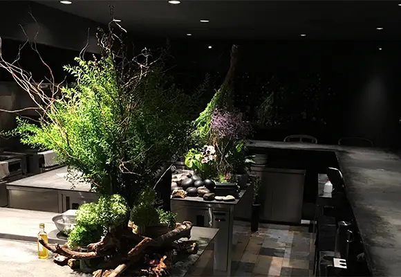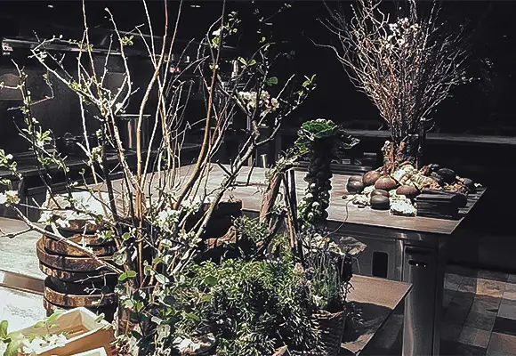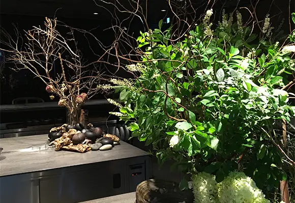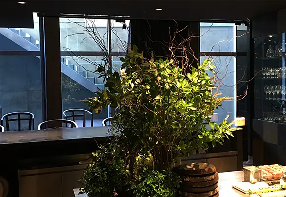 店内の植物装飾は、枝ものを中心に季節感を大切にしながらも、店舗で提供する飲料ペアリングコースのアプローチに合わせて定期的に変更しながら生け込みを行いました。店内の植物装飾を飲料プレゼンテーションの素材として活用。ユーカリを摘みブーケにグラスと共に巻き込んでブーケスタイルドリンクを仕上げたり。店内の装花から飲料の器を即興で作り季節感を演出。沢山のハーブを活け込んだ籠を器にして小さなハーブガーデンからお客様に摘んでドリンクとして提供など。実際に空間ディスプレイを提供商品に「参加させる」アプローチで空間装飾との繋がりを作り、視覚・味覚・嗅覚を通して体感する植物装飾にチャレンジする機会となりました。